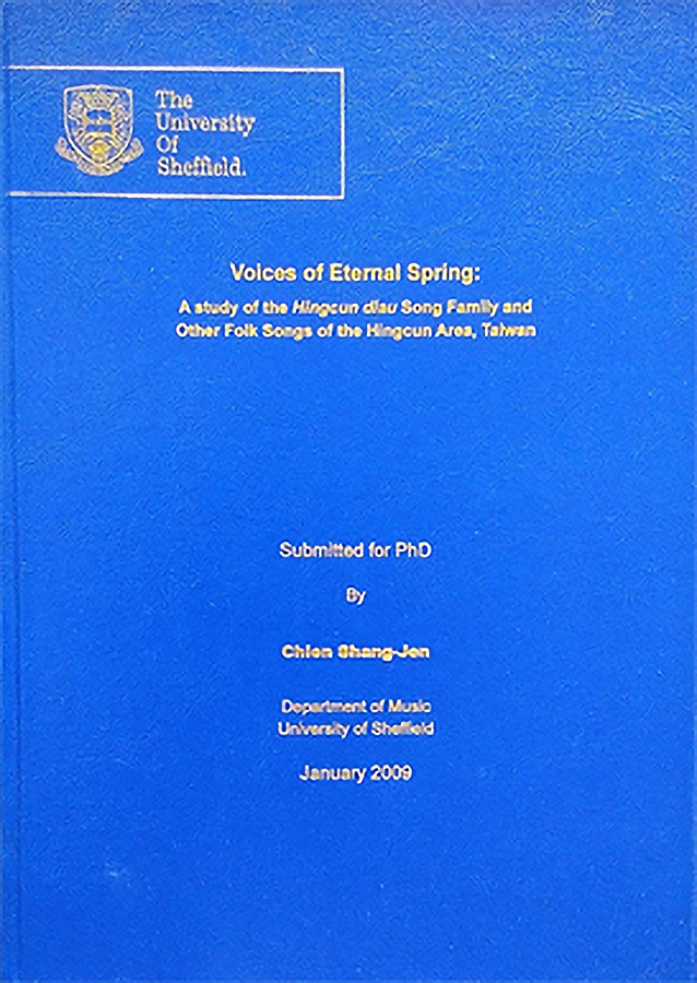 2010年《Voices of Eternal Spring: A Study of the Hêng-chhun tiāu Song Family and Other Folk Songs of the Hêng-chhun Area, Taiwan.》,英國雪菲爾大學民族音樂學博士學位論文;(台灣版:由屏東縣政府發行)。